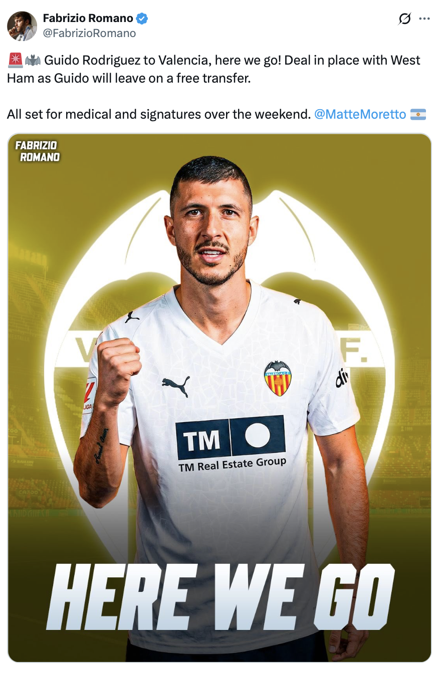 West Ham have made their next move in the transfer market – according to in-the-know Fabrizio Romano who has given his trademark ‘here we go’ confirmation of a done deal which represents something of a U-turn by West Ham who, just last week, suggested that their midfield star Guido Rodriguez would be staying at the club.