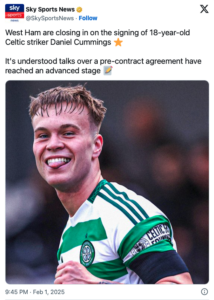 Celtic striker Daniel Cummings who I reported on in a previous article is near to signing a pre-contract with West Ham as confirmed this morning by skysportsnews.com.