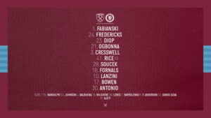 West Ham United Starting XI: Fabianski, Fredericks, Diop, Ogbonna, Cresswell, Rice (c), Soucek, Fornals, Lanzini, Bowen, Antonio