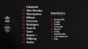 Fabianski | Wan Bissaka, Mavropanos, Kilman, Emerson | Rodriguez, Soucek, Soler | Bowen, Fullkrug, Kudus