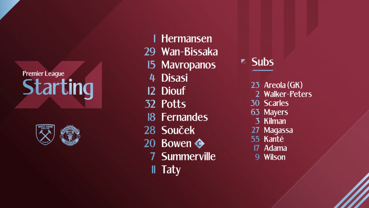 Hermansen | Wan Bissaka, Mavropanos, Disasi, Diouf | Soucek, Potts, Fernandes | Summerville, Castellanos, Bowen(c)