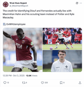 ..of the duo to Kyle Macaulay and Graham Potter: According to ExWHUEmployee, (quoted by WestHamReport on twitter), ‘the credit for signing Diouf and Fernandes actually lies with Max Hahn (West Ham United’s head of Technical Recruitment and Analysis ] and his scouting team’